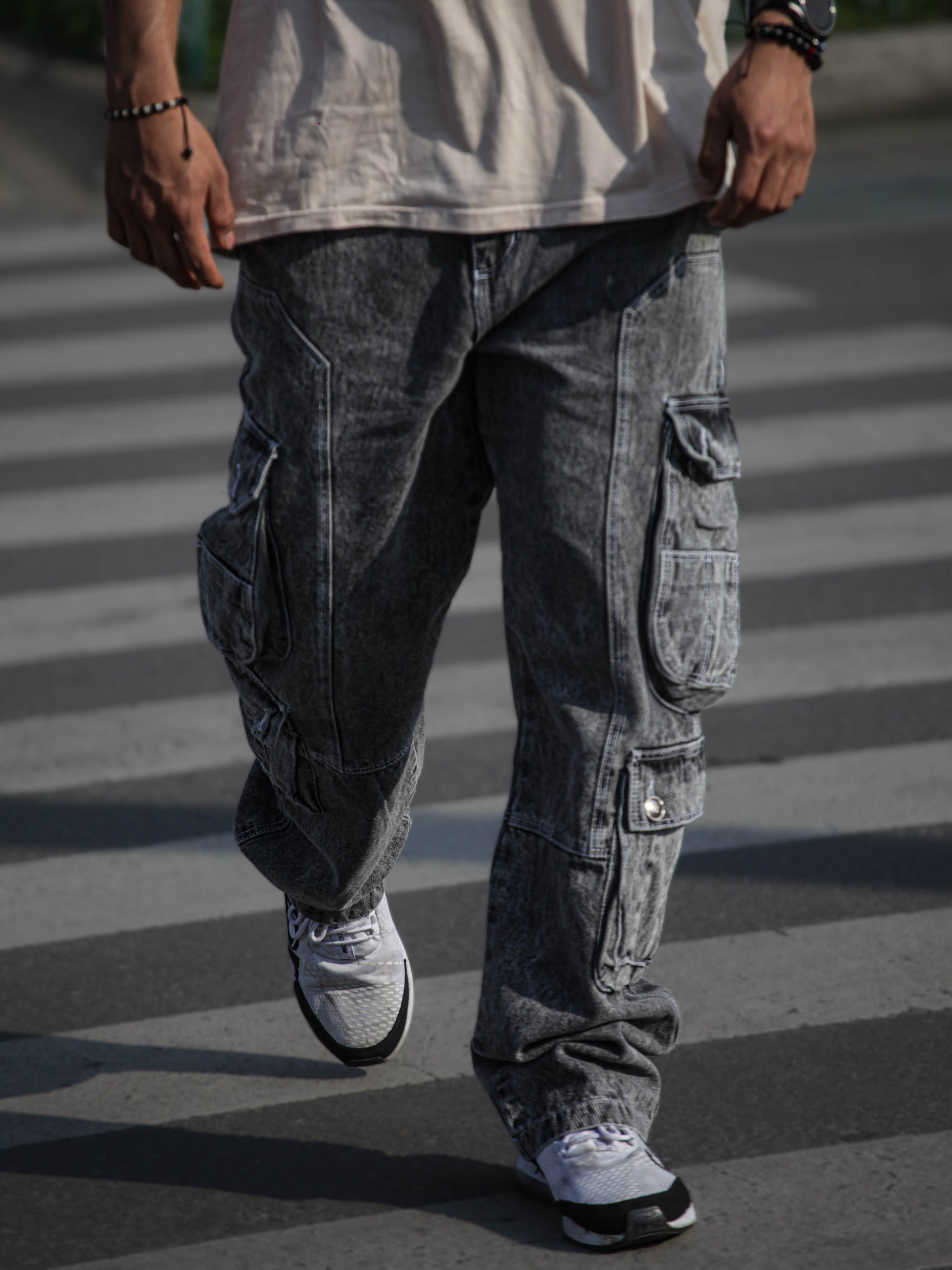 Pantalón Cargo Oversize en Jean Rígido Bota Ancha para hombre - Gris. Corte suelto ancho clásico, confeccionado en tela rígida para mayor resistencia. Cuenta con cinco amplios bolsillos laterales y bolsillos costados, ofreciendo un ajuste a la cintura que se adapta al cuerpo. Su diseño urbano y funcional es ideal para quienes buscan comodidad y estilo práctico.