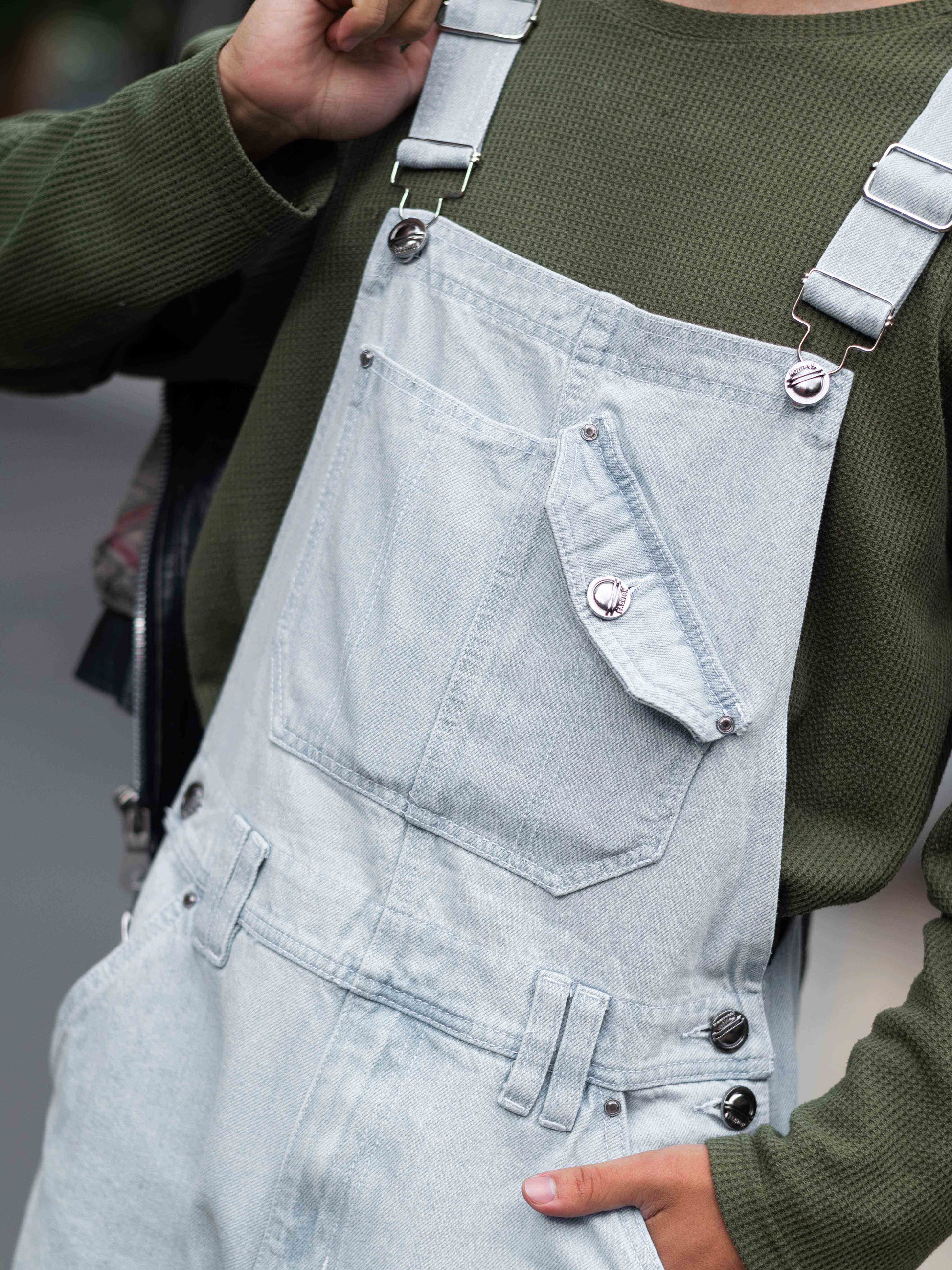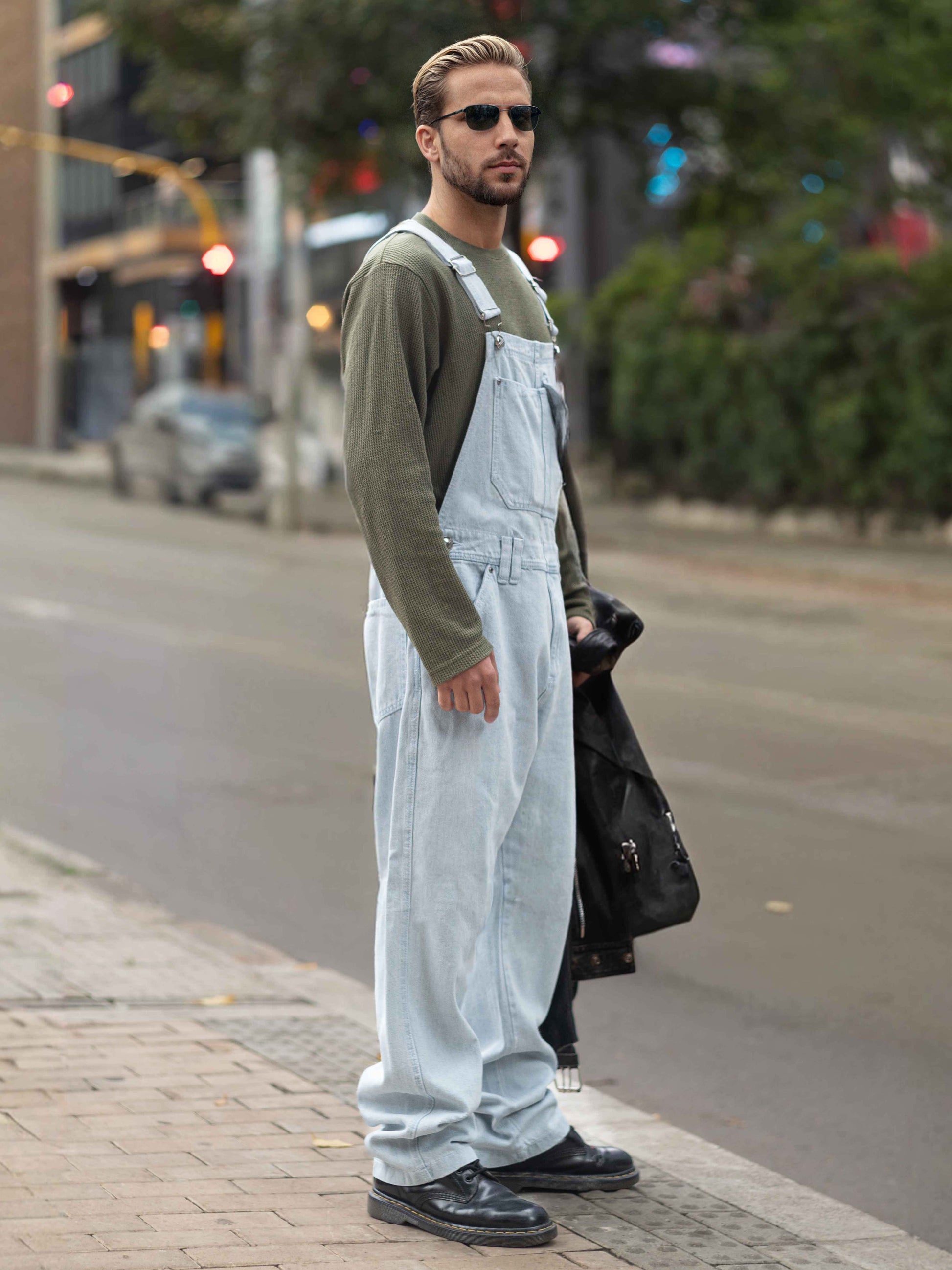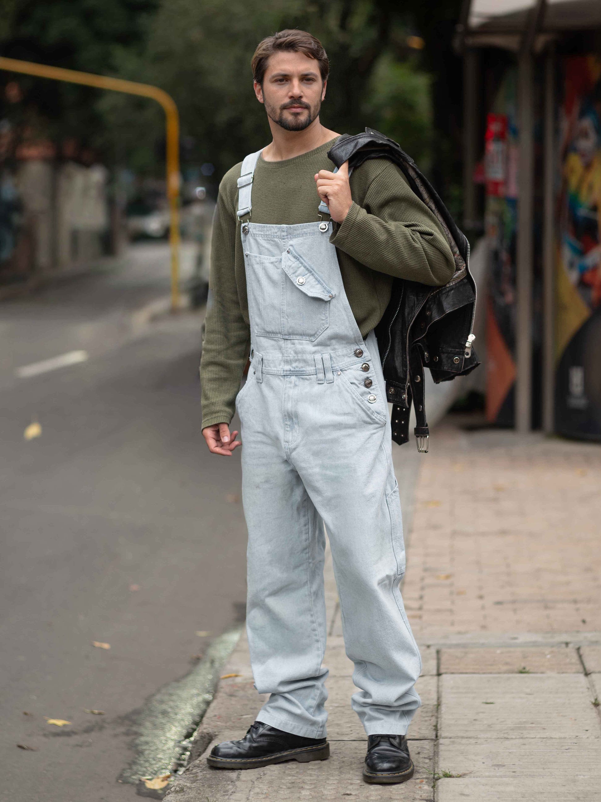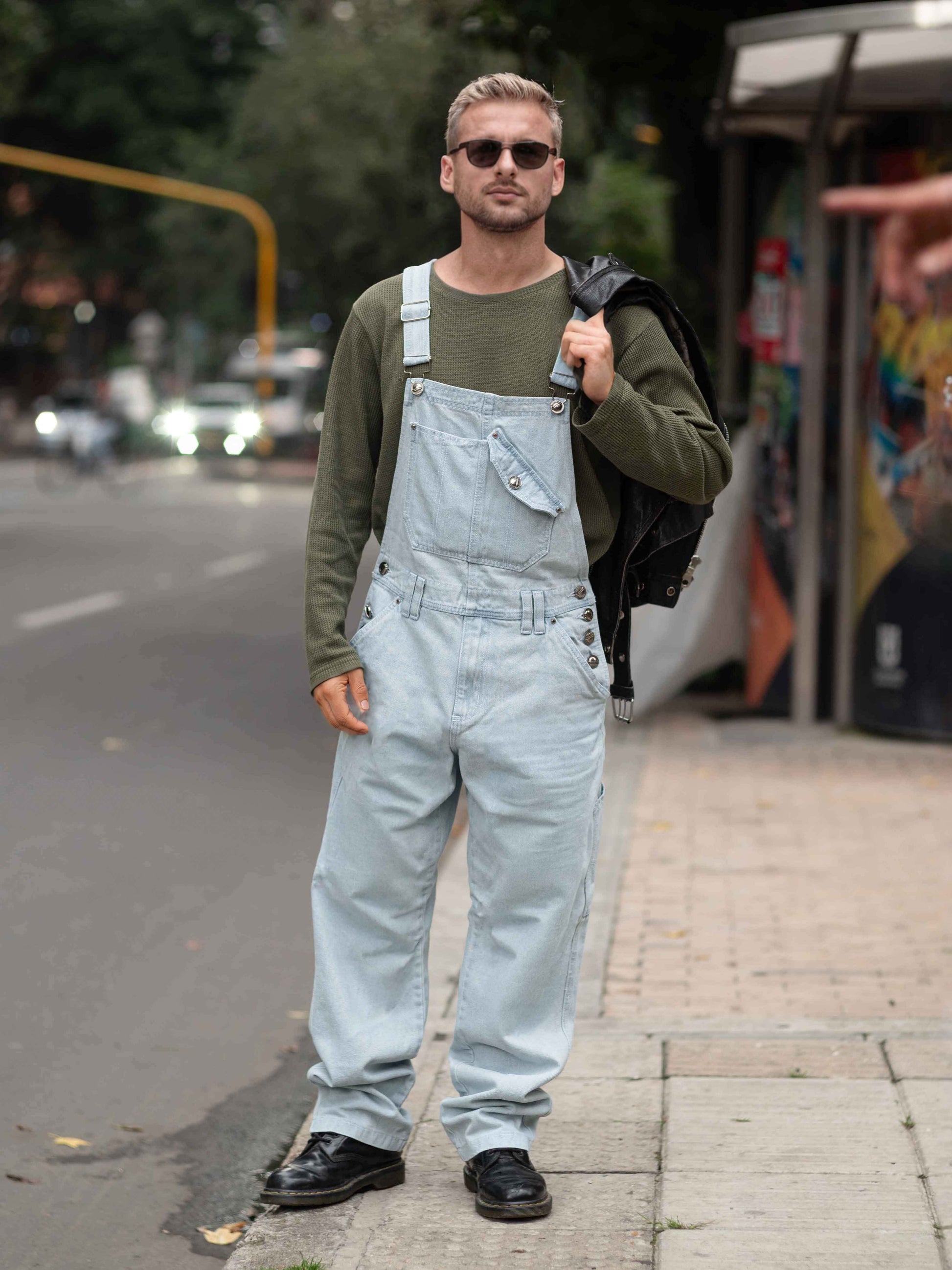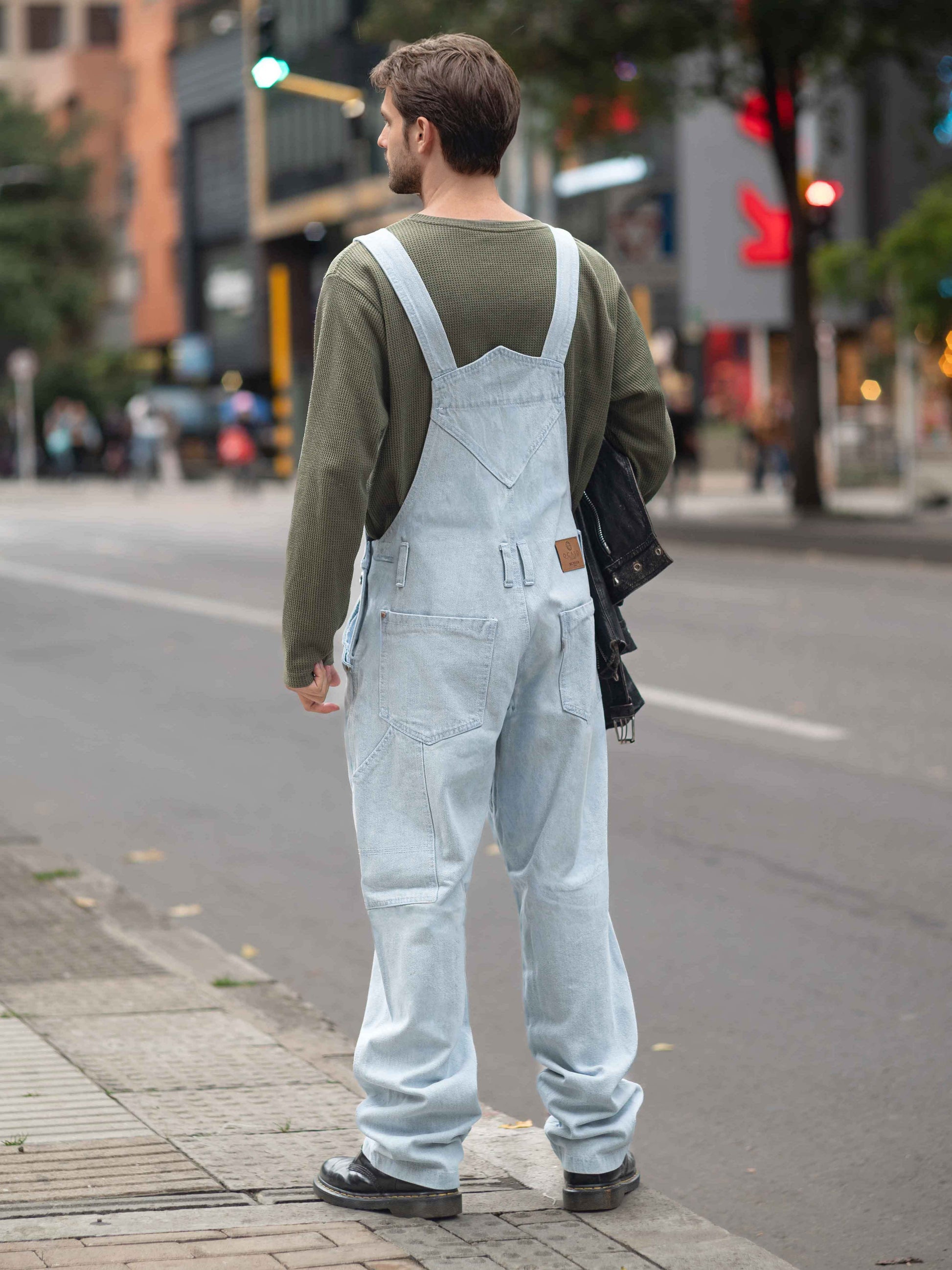 Overol Clasico Hop para Hombre en Jean Rigido Bota Ancha - Azul Claro - Braga Oversize. Hecho de denim rígido ofrece una notable resistencia y funcionalidad. Cuenta con un bolsillo en el peto con tapa y botón, amplios bolsillos rectos, y un diseño de bolsillo tipo carpintero en la pierna. Sus tirantas ajustables y cuatro botones en cada lado, junto con un hilo de contraste, lo hacen adecuado para estilos clásicos, retro o juveniles oversize.