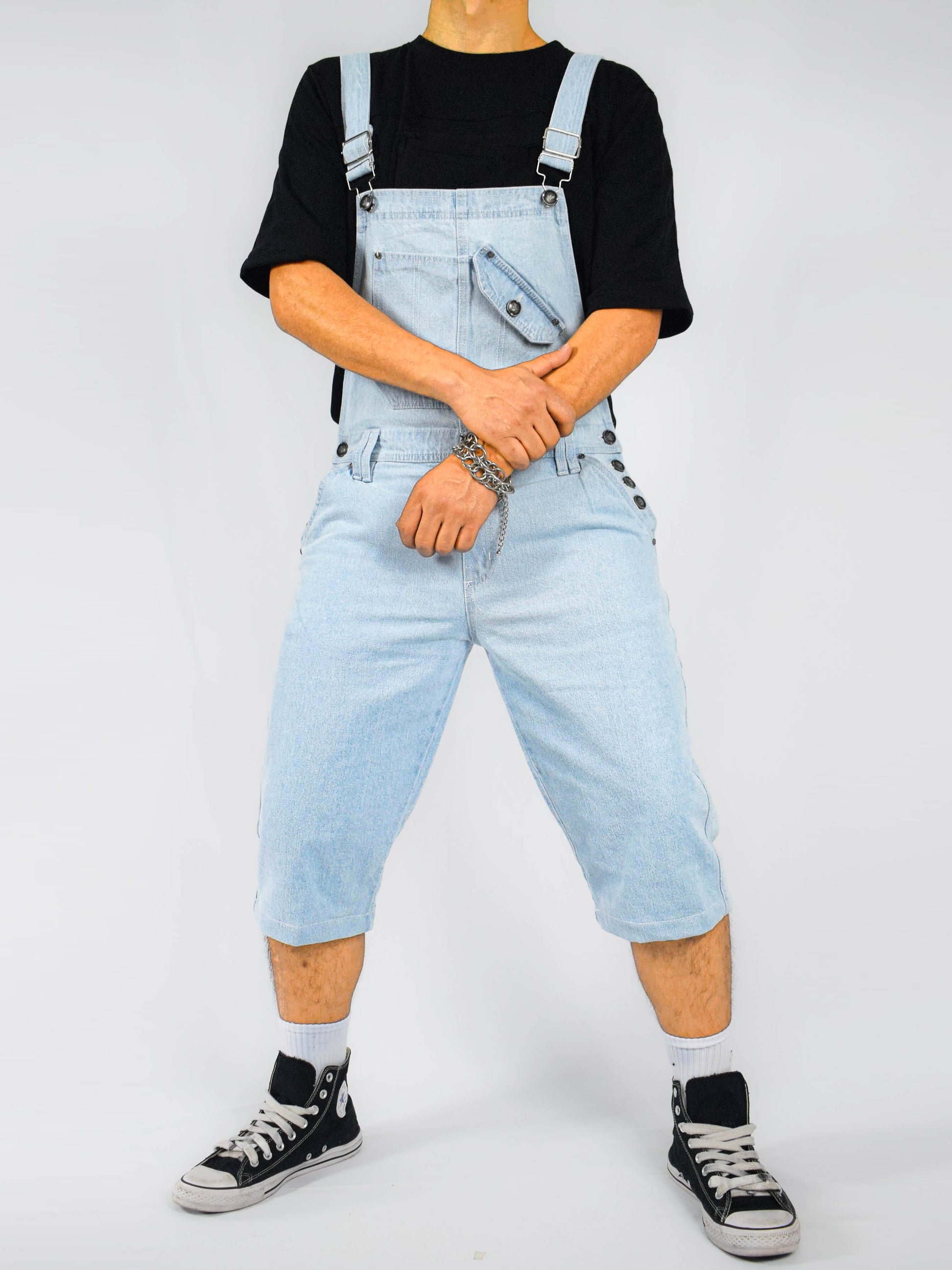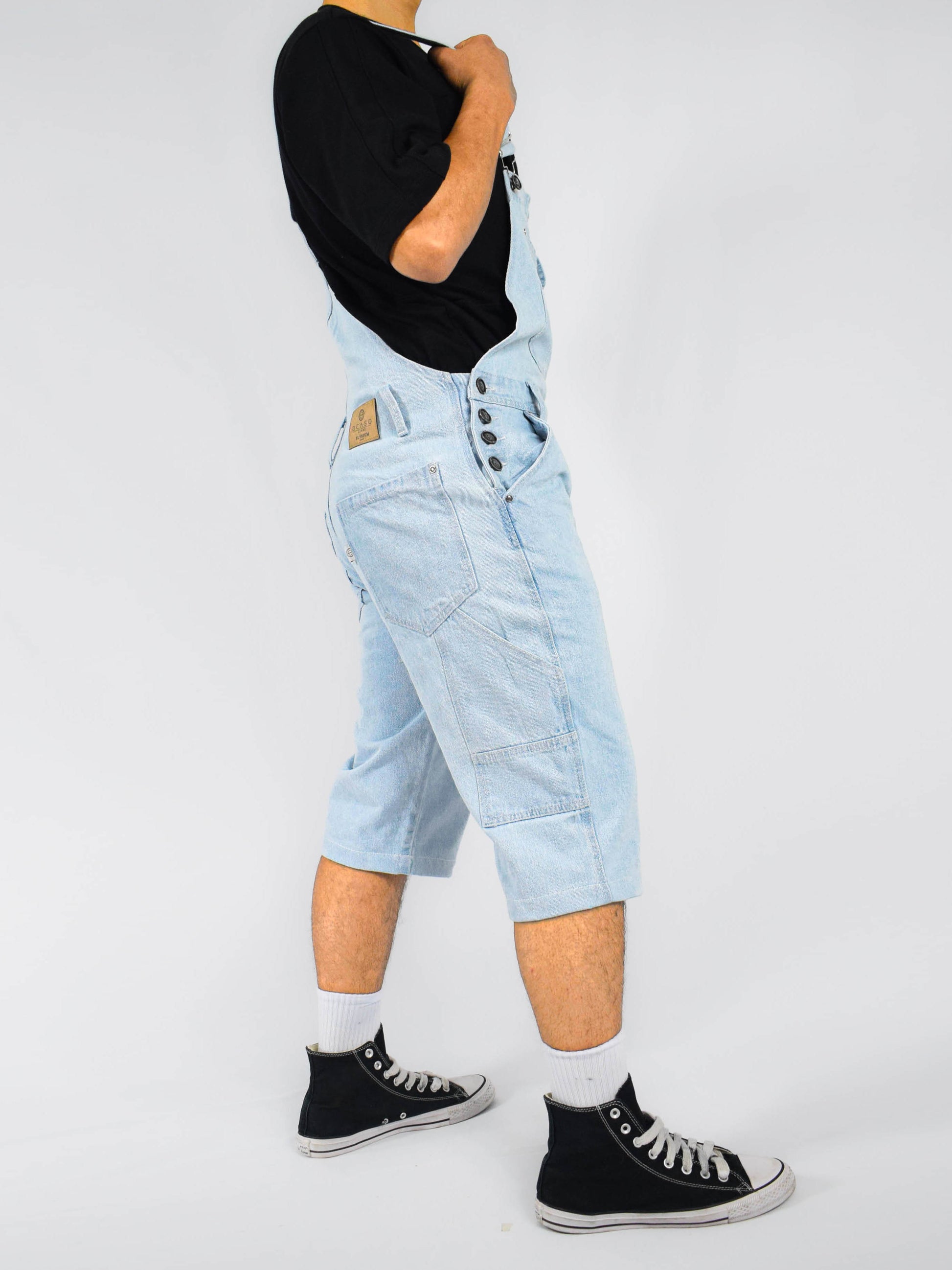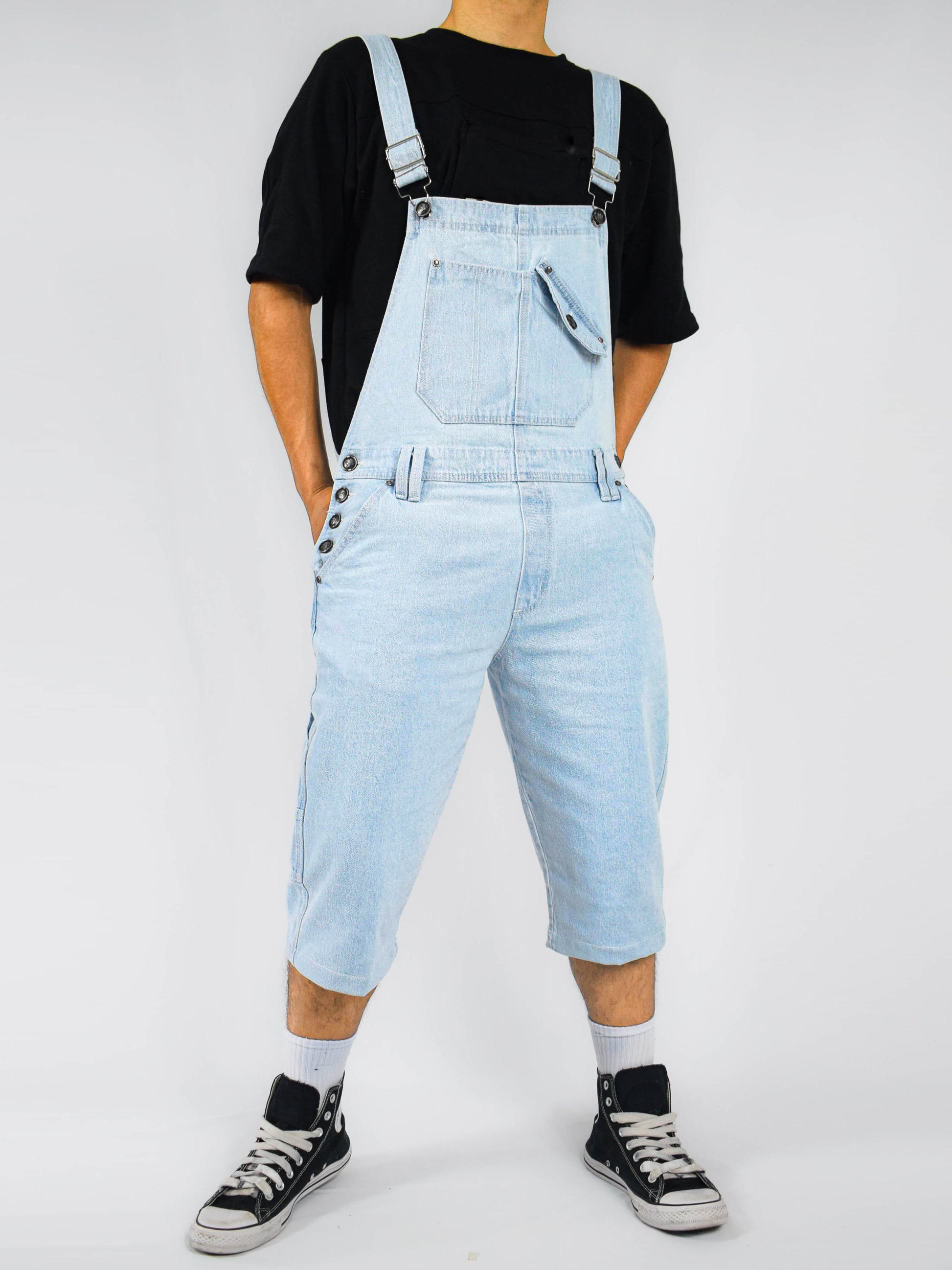Overol Corto Clasico Hop para Hombre en Jean Rigido Bota Ancha - Azul Claro. En tela jean rígida, ideal para mayor resistencia. Cuenta con un bolsillo funcional en el peto con tapa y botón, bolsillos amplios de corte recto y un diseño de bolsillo tipo carpintero en la pierna. Su largo tres cuartos, tirantas ajustables, cuatro botones en cada lado y detalles en hilo de contraste la hacen perfecta para estilos clásicos, retro o juveniles en corte oversize.