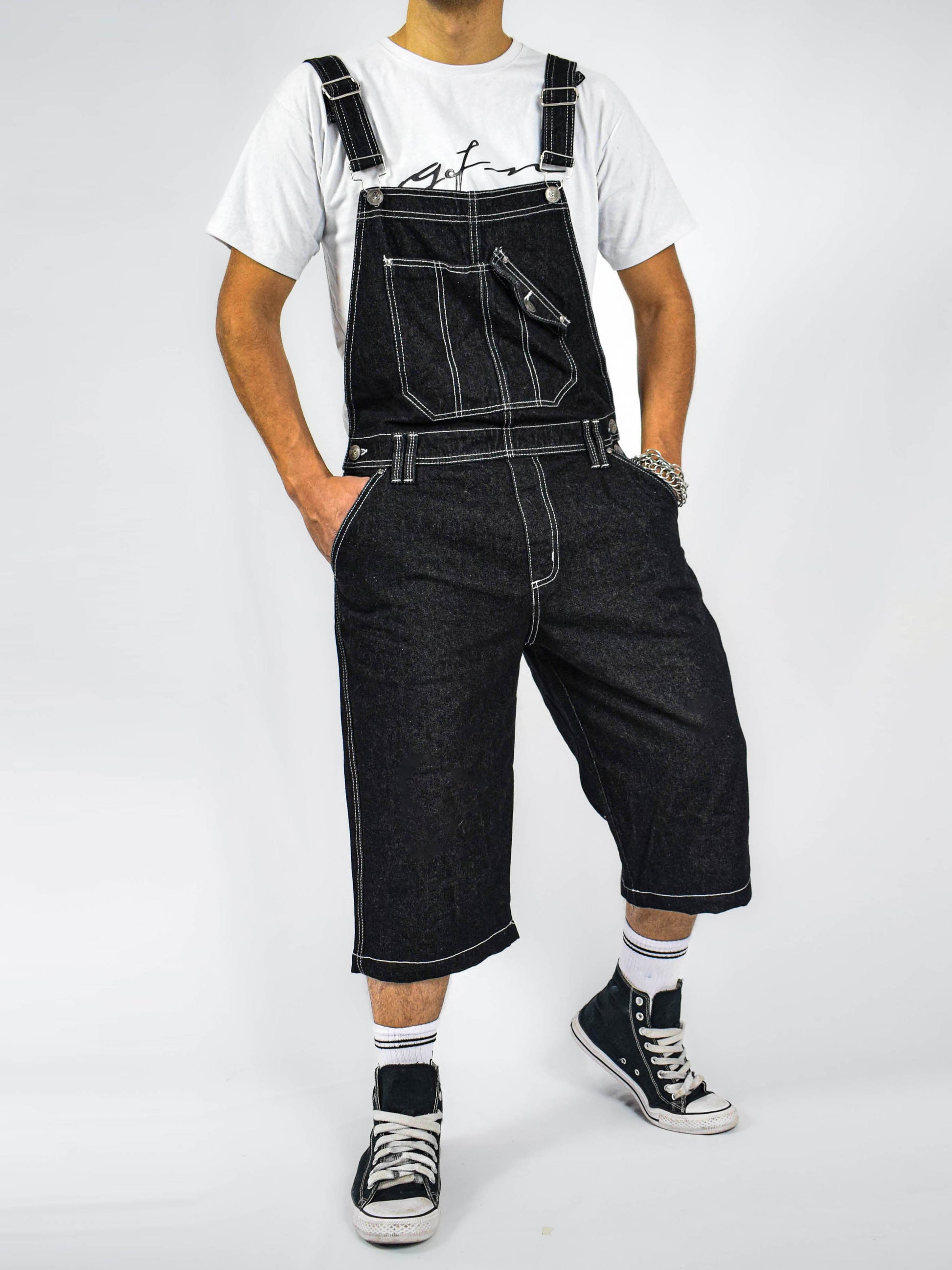 Overol Corto Clasico Hop para Hombre en Jean Rigido Bota Ancha - Negro Pimienta. En tela jean rígida, ideal para mayor resistencia. Cuenta con un bolsillo funcional en el peto con tapa y botón, bolsillos amplios de corte recto y un diseño de bolsillo tipo carpintero en la pierna. Su largo tres cuartos, tirantas ajustables, cuatro botones en cada lado y detalles en hilo de contraste la hacen perfecta para estilos clásicos, retro o juveniles en corte oversize.