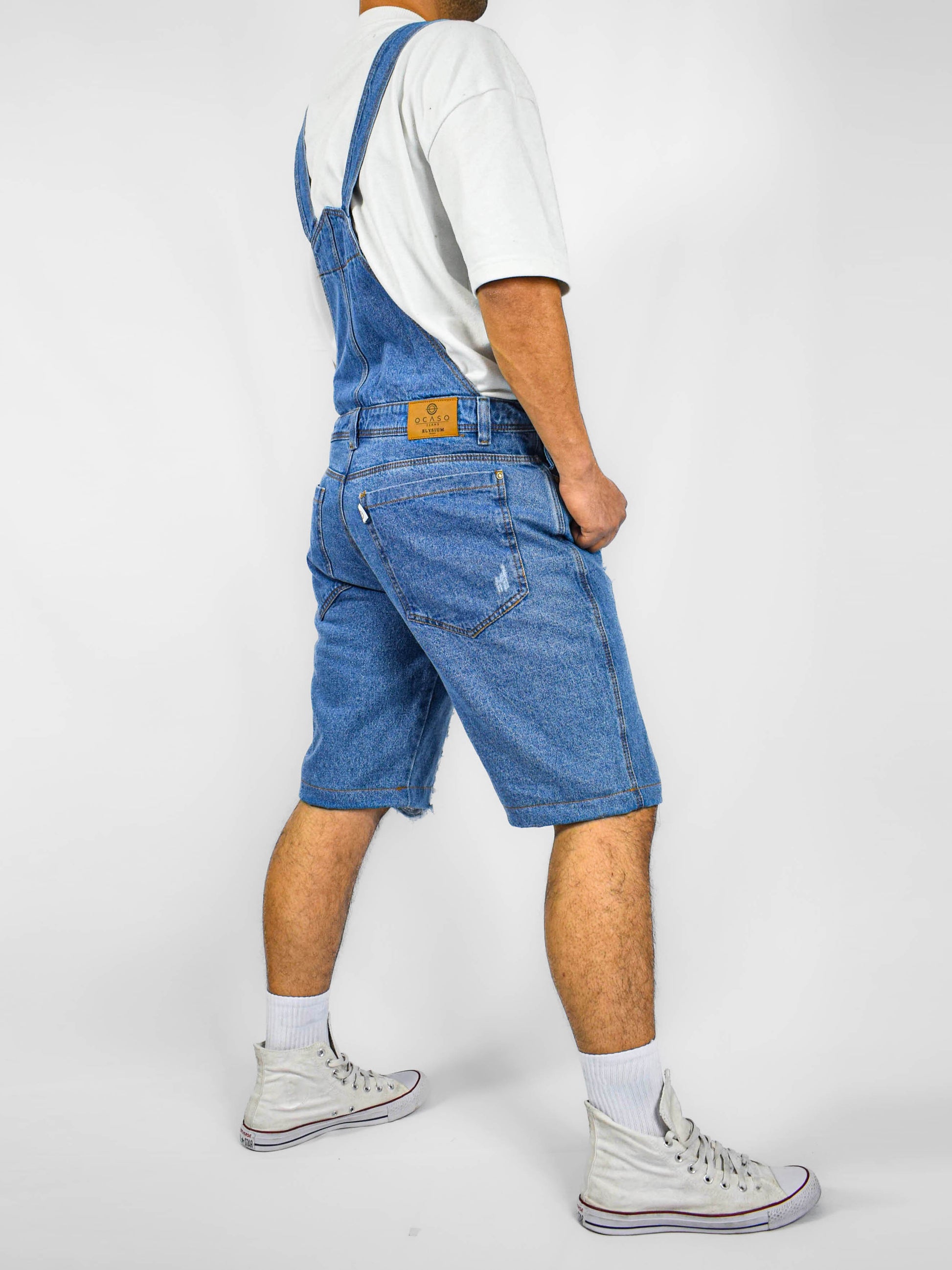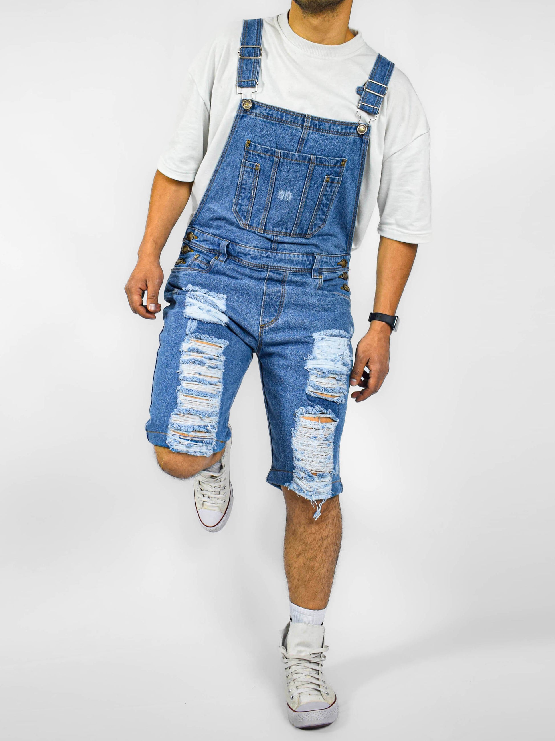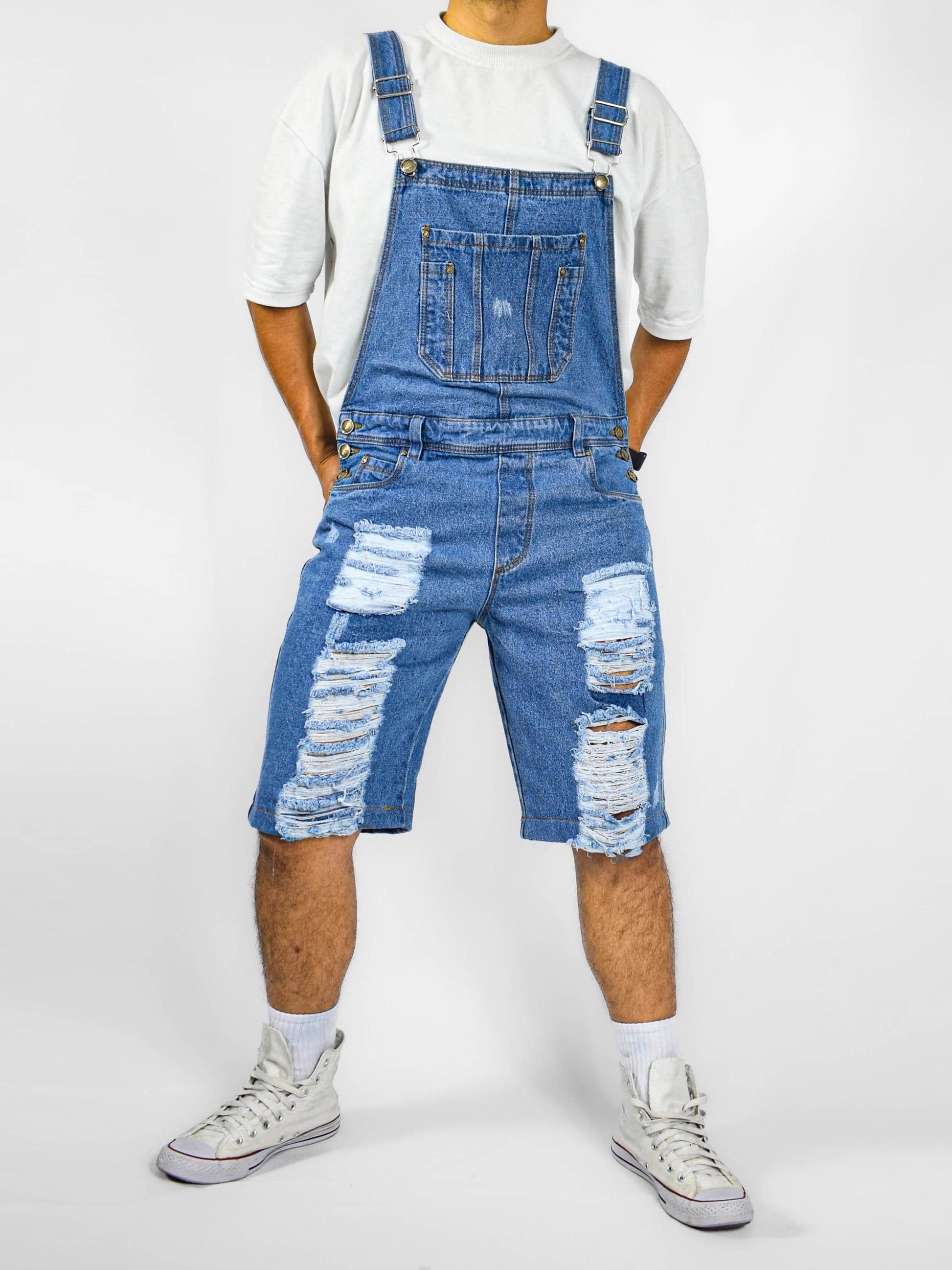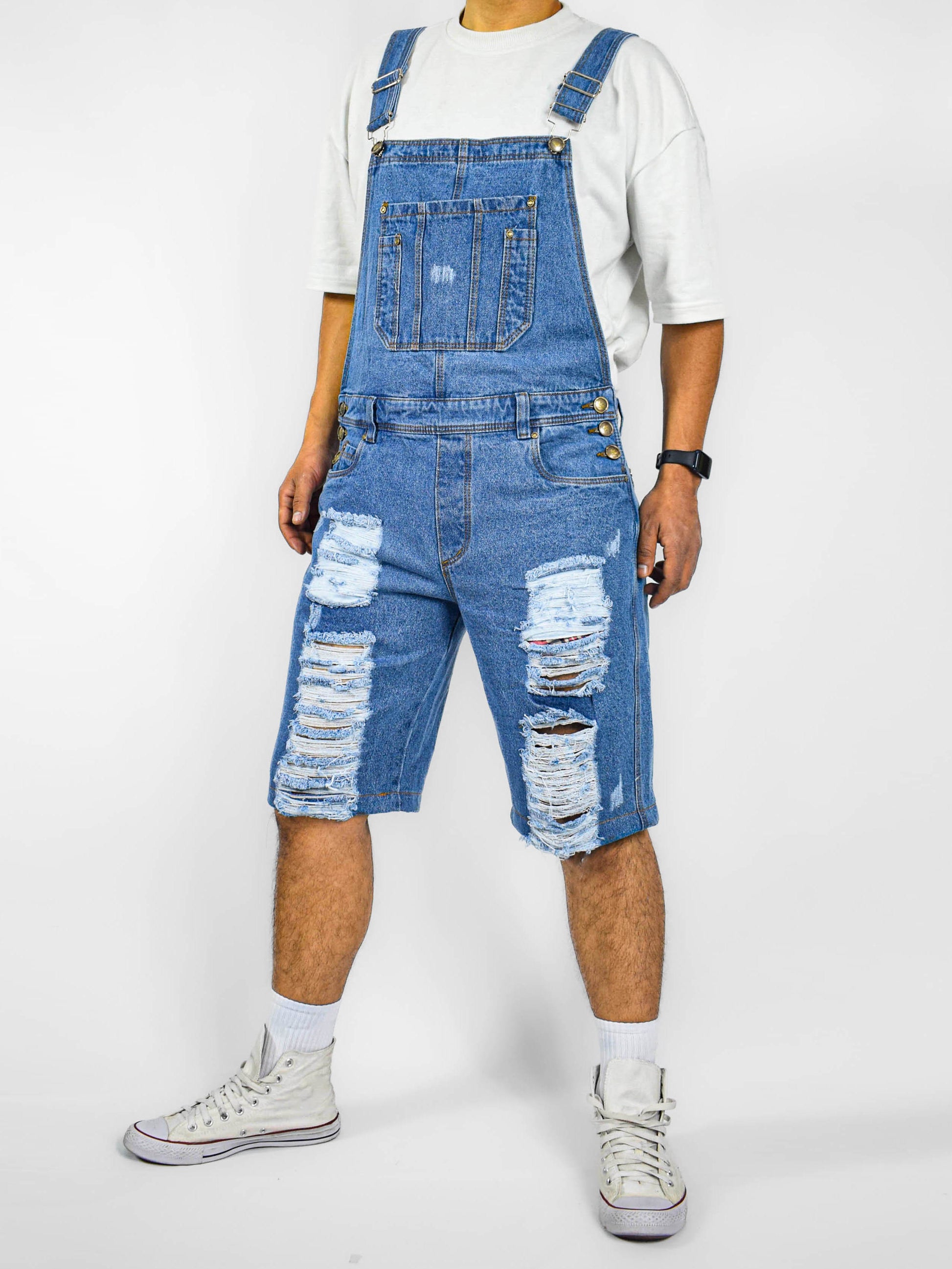 Overol Corto Rigido Con Rotos para Hombre en Jean Rigido Bota Recta - Azul Medio. Confeccionado en tela de jean rígida para mayor resistencia. Presenta detalles de rotos y desgastes que aportan un toque de estilo. Cuenta con un bolsillo clásico en el peto, tres bolsillos funcionales, amplios bolsillos laterales y tirantas gruesas ajustables en extensión. La espalda larga y el diseño oversize lo hacen ideal para estilos clásicos y tradicionales.